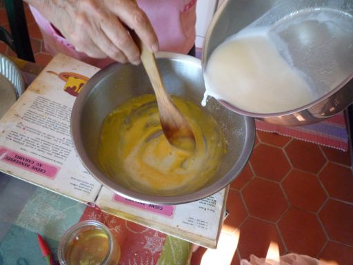 - Pour the boiling milk into the mixture a little by little while whisking continuously to avoid curdling. And then stir in the rest of the milk until the mixture is well combined.
